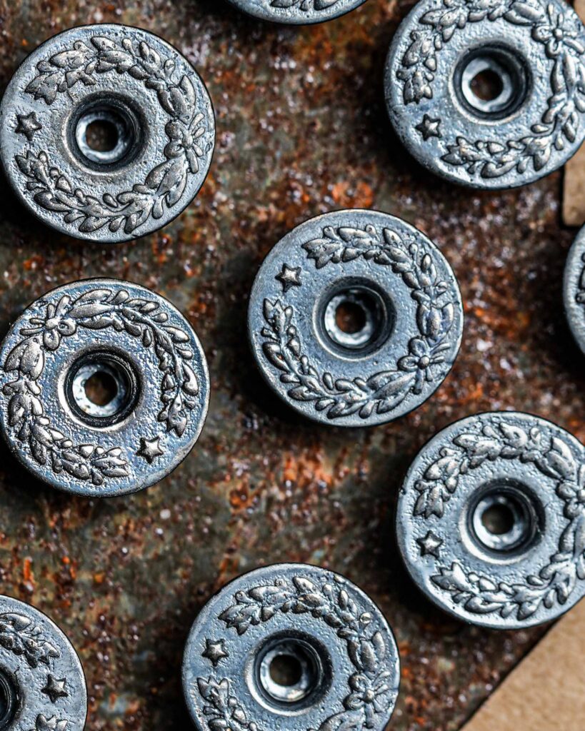 - Middle buttons: Scovill olive branch design, vintage-style two-prong fastening