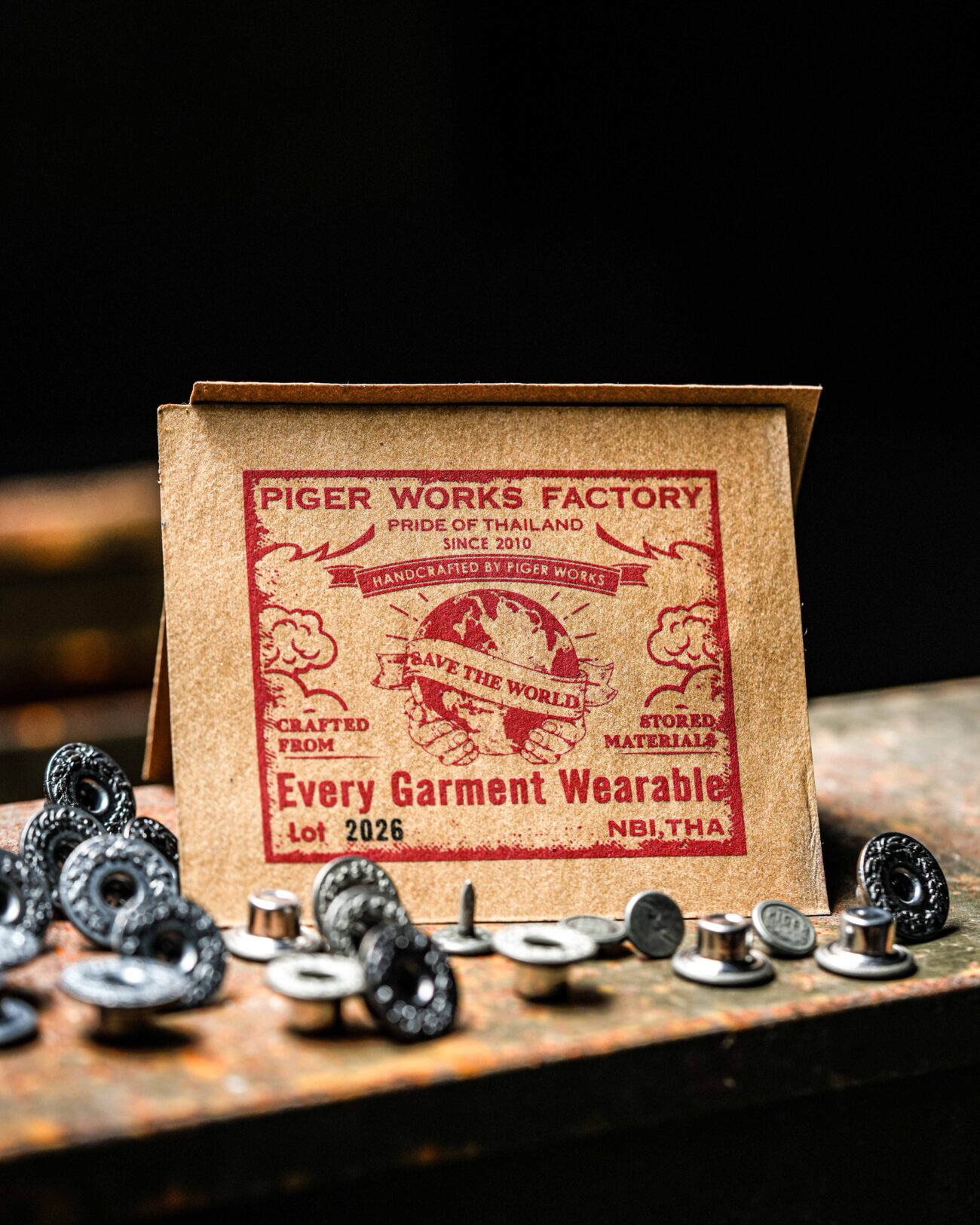 - Rivets: Scovill full-head rivets, used in the early days of PIGER WORKS