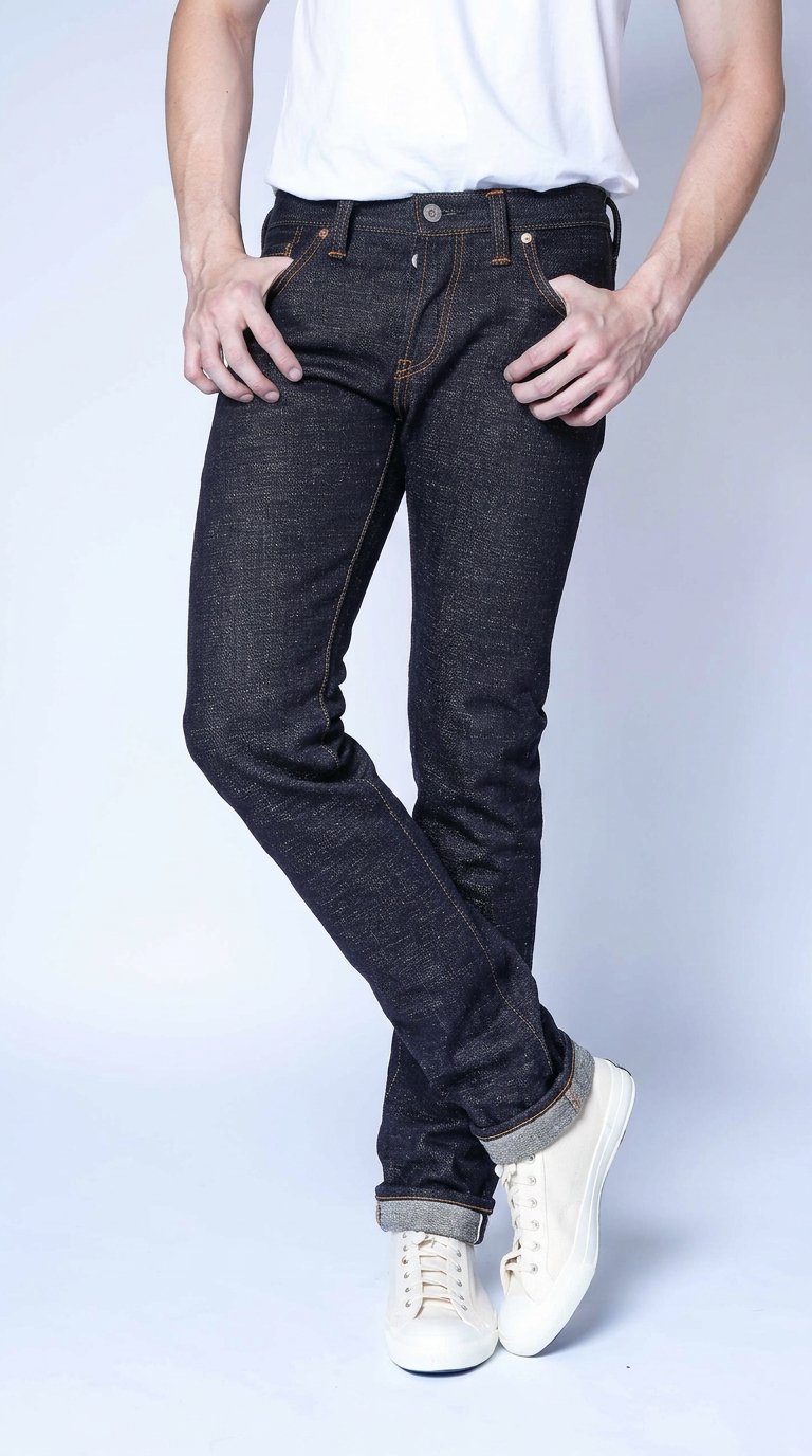 Jeans made from 21oz Broken twill, Slubby, Unsanforized fabric. The character of the denim fabric woven on a narrow loom with a traditional selvage, 21oz weight with a Broken Twill weave structure uses Slubby spun yarn with uneven yarn sizes, dyed in dark, deep shades for beautiful fade dimensions. It comes in the form of an Unsanforized fabric with a high shrinkage rate but will not twist as a result of the alternating left/right/left weave structure, also known as Broken Twill. The fabric has a rough texture and a distinct fabric pattern.