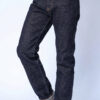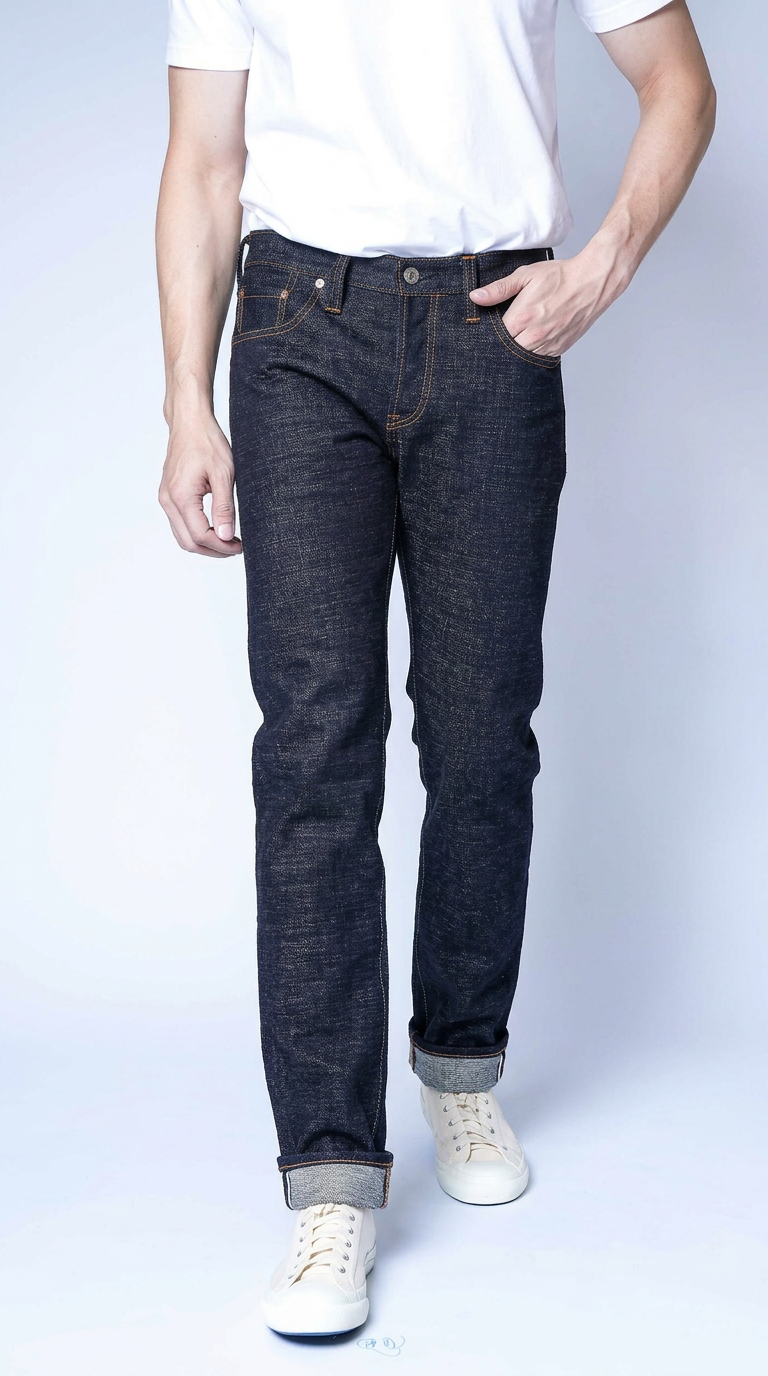 Jeans made from 21oz Broken twill, Slubby, Unsanforized fabric. The character of the denim fabric woven on a narrow loom with a traditional selvage, 21oz weight with a Broken Twill weave structure uses Slubby spun yarn with uneven yarn sizes, dyed in dark, deep shades for beautiful fade dimensions. It comes in the form of an Unsanforized fabric with a high shrinkage rate but will not twist as a result of the alternating left/right/left weave structure, also known as Broken Twill. The fabric has a rough texture and a distinct fabric pattern.